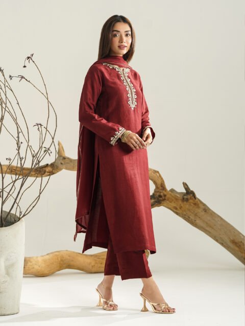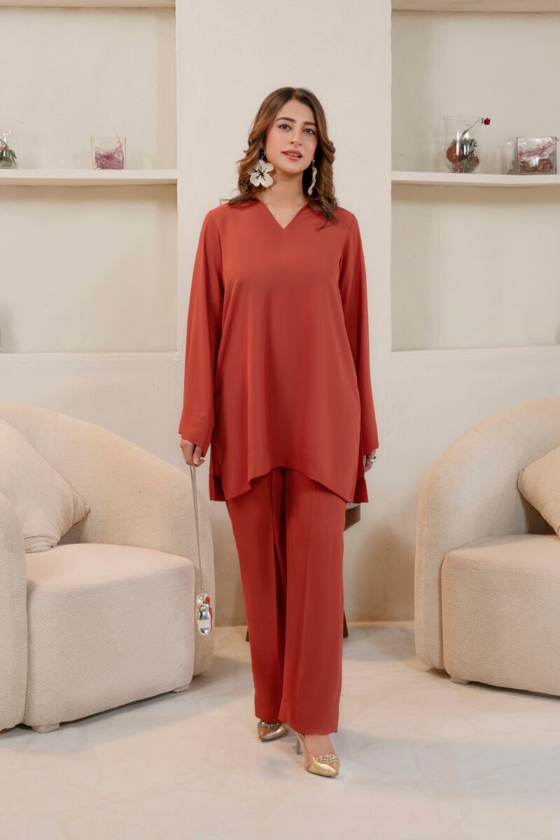 A stylish two-piece co-ord set crafted from lightweight, flowy georgette fabric. Featuring a relaxed-fit tunic with a V-neckline and straight-cut trousers, this rust orange ensemble offers effortless elegance and all-day comfort—perfect for casual chic and semi-formal wear.