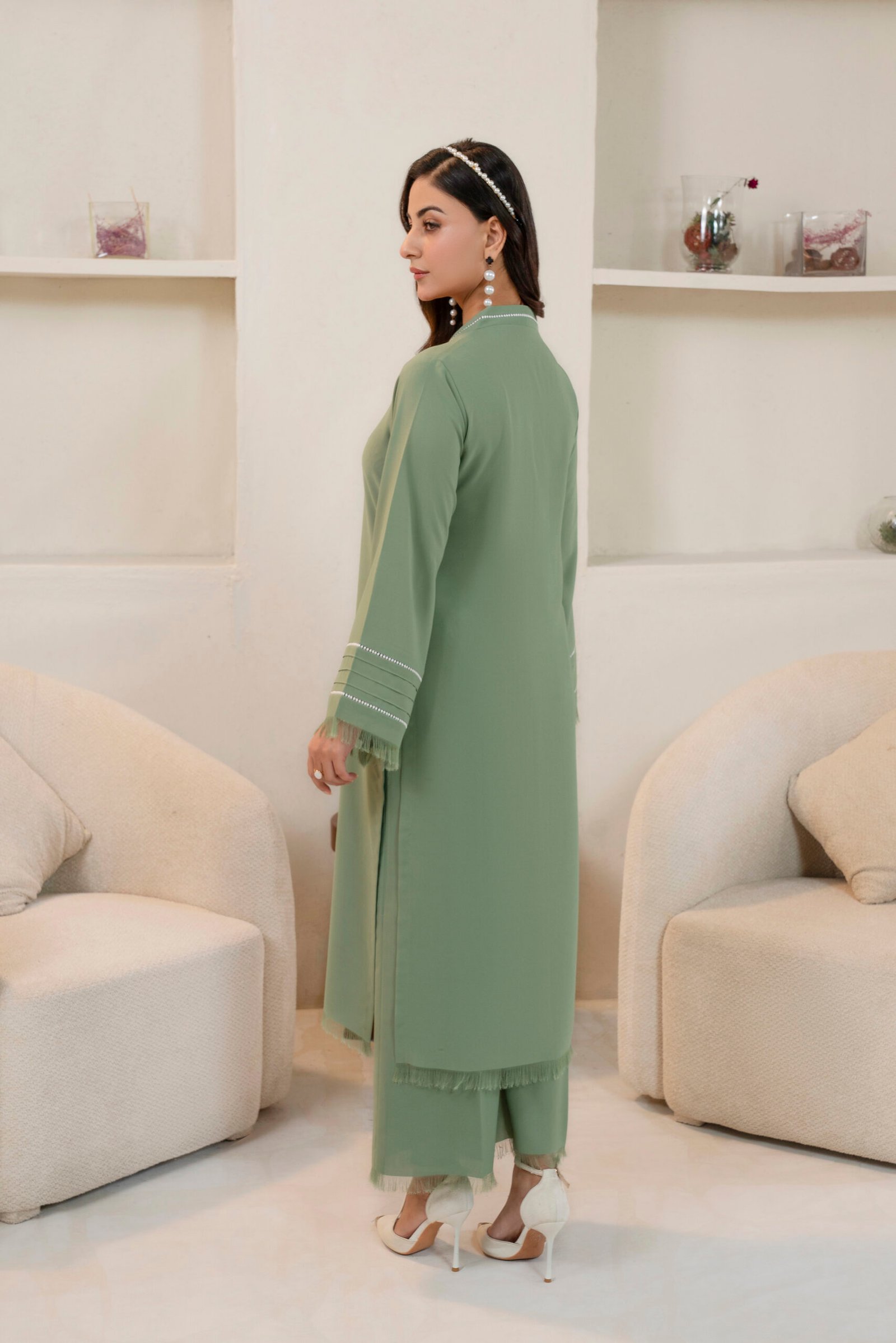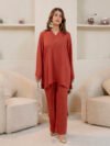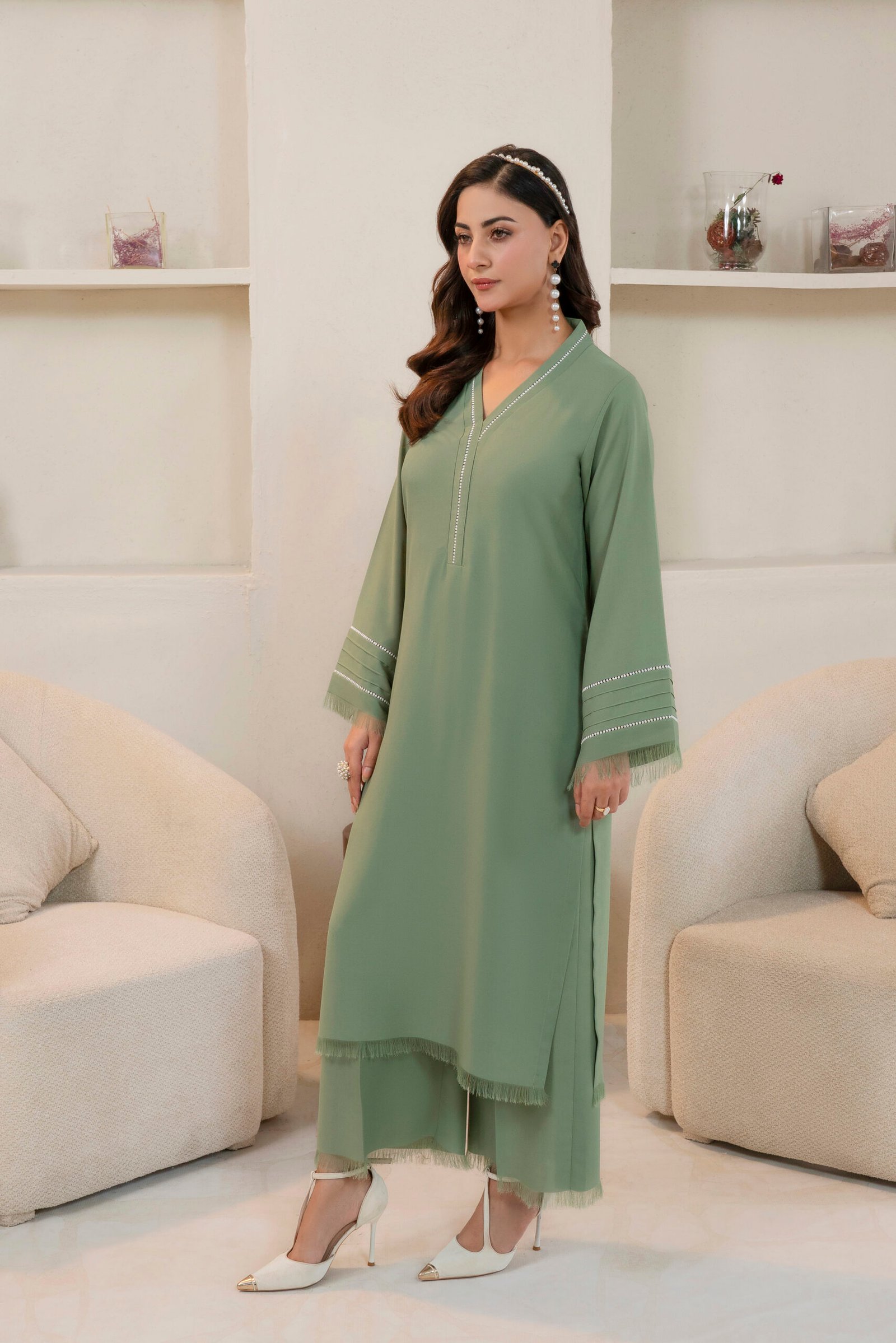 An elegant two-piece outfit crafted from lightweight georgette fabric, featuring a straight-cut tunic with lace detailing and wide-leg trousers. Soft, flowy, and effortlessly refined—perfect for day to evening wear.