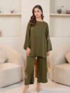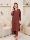 A stylish co-ord set in a rich shade of purple is fashioned from delicate georgette fabric, offering a fluid and elegant silhouette. The top and trousers are adorned with tasteful lace detailing, adding a subtle touch of sophistication and charm to the overall design.