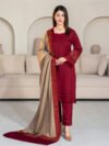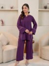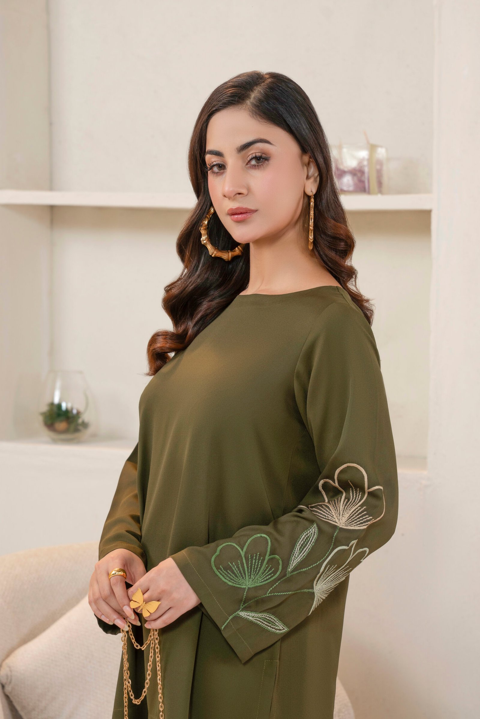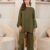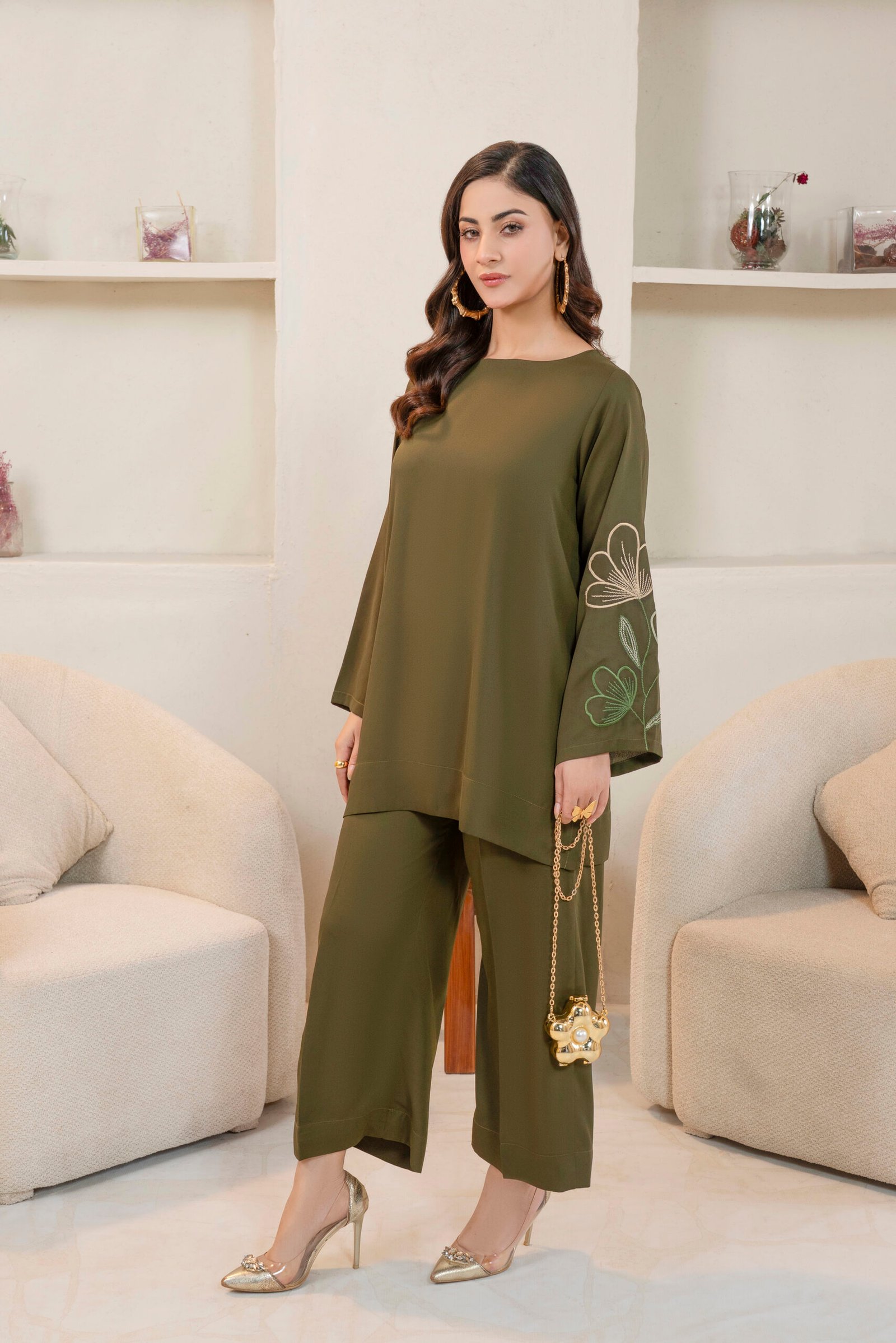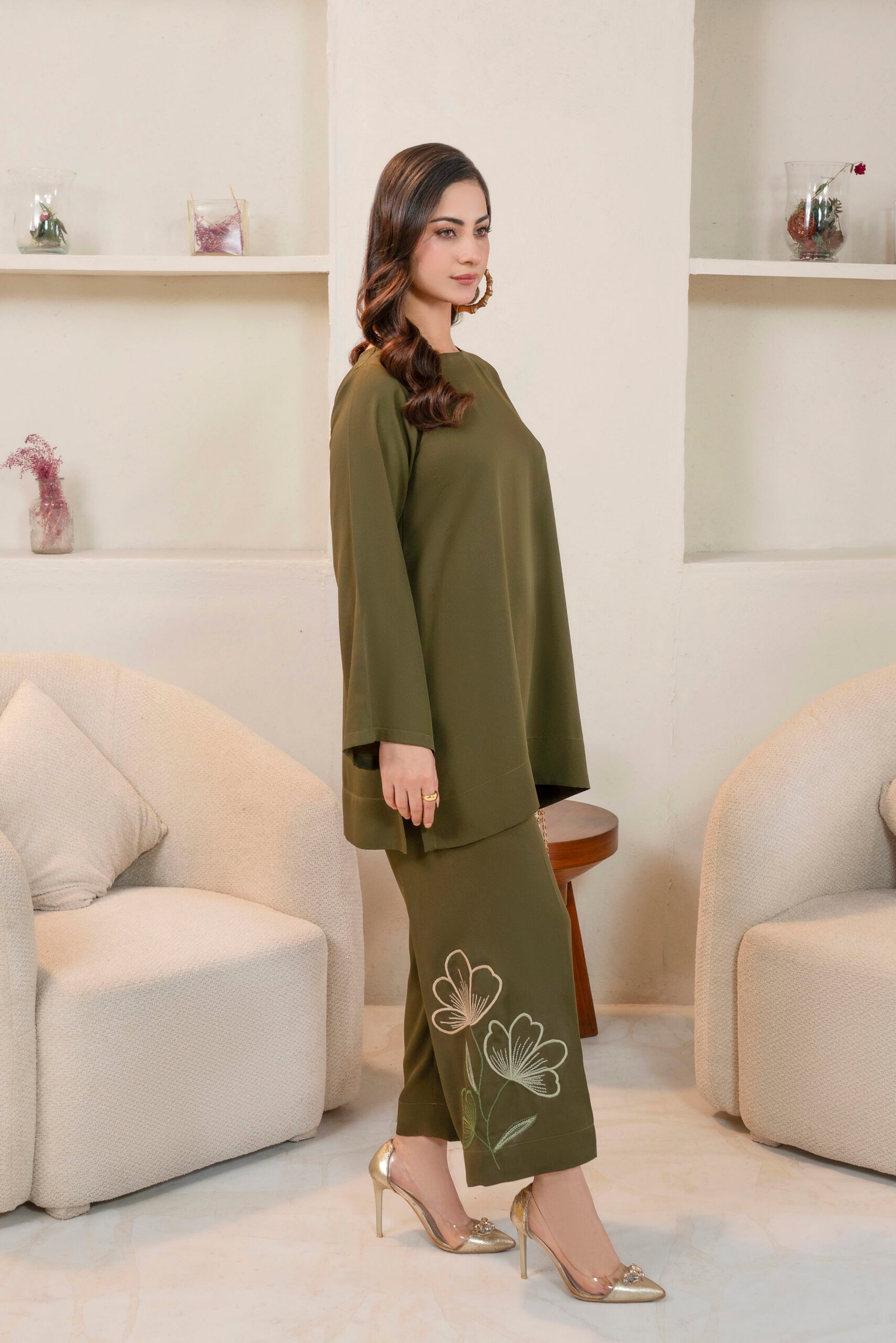 An elegant co-ord set olive green ensemble is crafted from luxurious georgette fabric, offering a graceful drape. The top features intricate embroidery on one arm, while the matching trousers showcase complementary detailing on one side, adding a touch of sophisticated artistry to the design.