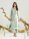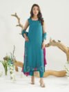 Paired with chic culotte trousers and a sheer net dupatta finished with shimmering sequence beads on the pallu, this ensemble is a timeless choice for graceful, statement-making occasions.