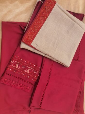 The deep radish mehroon shade adds a bold, captivating presence, while the intricate hand-machine embroidery gives the dress a graceful, artisanal finish. The sleeves are enhanced with delicate organza and lace work, adding softness, texture, and a feminine touch that elevates the entire silhouette.